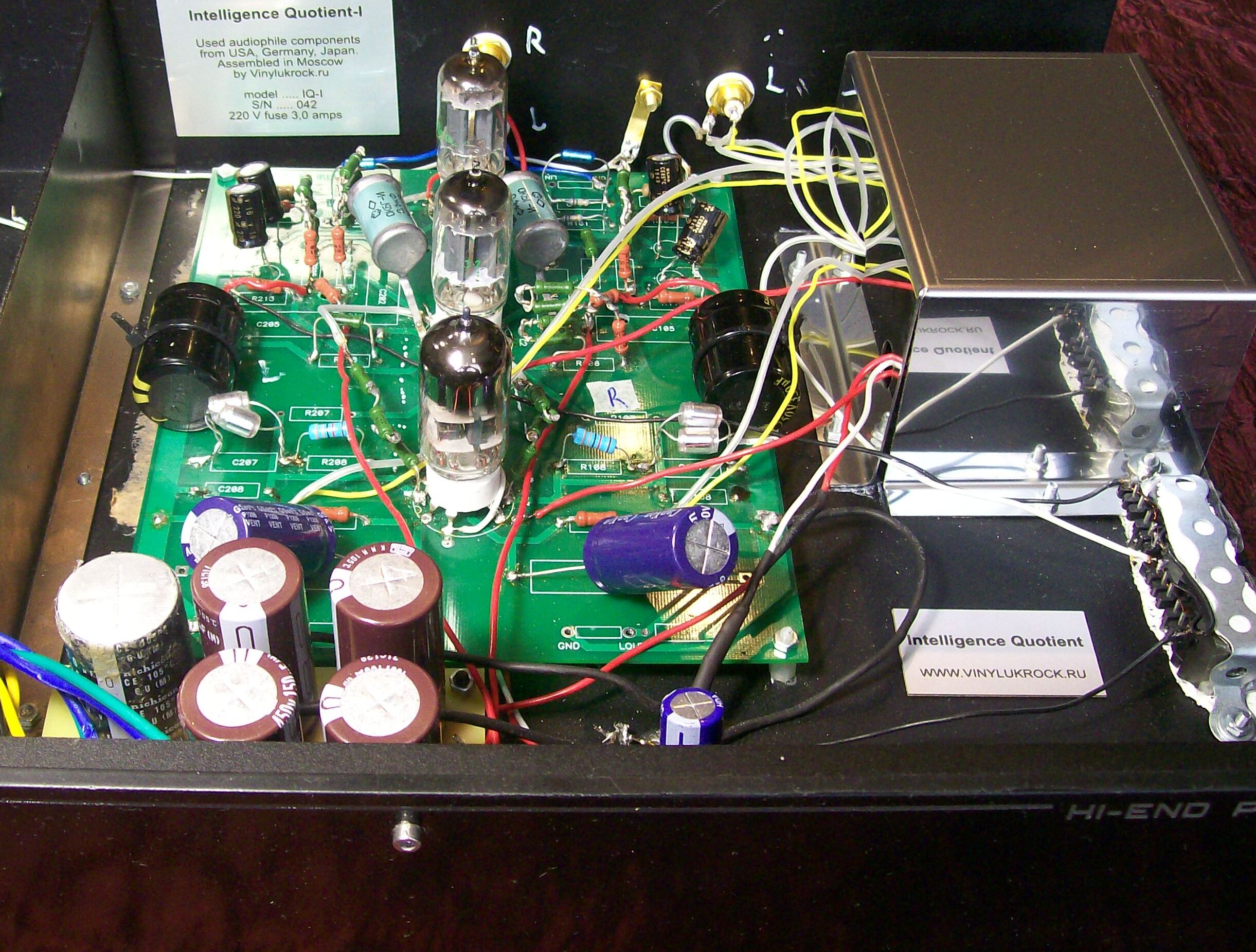 Сравнивали корректоры: IQ-nv и EAR 88 pb с стоимостью 6300 $, который обладает аналогичными трансформаторами. Возможно вы сочтете невероятным, но IQ-nv очевидно переиграл Yoshino EAR 88 pb . Сравнивали с Audio Note M3 RIAA US Retail: $ 6,000 - вердикт в пользу IQ-nv. Сравнивали с Ypsilon VPS 100, - US Retail: $ 26,000 - потенциал одинаков. Ypsilon VPS 100 скорее более деликатен. IQ-nv более выразительный и харизматичный. Оба корректора обладают одинаковым набором основополагающих элементов, формирующих звук. А именно : индуктивную катушку, коррекирующую РИАА в ВЧ области, и выходной согласующий трансформатор. Также у них одинаковое количество ламп, по три сдвоенных триода. Соответственно они обладают равным потенциалом. Прямого сравнения не было, но обладатель EAR 912, приобрел для себя IQ-new voice и отметил, что играют они на одном уровне. Корректор IQ-new voice он слушает с предварителным усилителем Audio Note M3. Важно отметить, что EAR 912 ( как и EAR 88 pb) состоит из 2-х неразделимых частей : собственно корректора и предусилителя, между которыми находится потенциометр. Нет возможности в EAR 912 отделить корректор от предусилителя, так что приходится оценивать его в связке. Потому владелец одновременно EAR 912 и IQ-new voice, подключает последний через предусилитель Audio Note M3, чтобы с имитировать потенциал EAR 912. Надеюсь, вы не запутались. Корректор IQ-nv создан на базе авторитетного корректора IQ-I c важным дополнением в виде выходных согласующих трансформаторов вместо винтажных бумажно-фольговых конденсаторов Сименс , а также применением индуктивностей в цепи коррекции. Индуктивности в цепи коррекции и выходные согласующие трансформаторы радикально улучшают звучание корректора, а также переводят его на высший технологический уровень. Таким образом отдано предпочтение трансформаторной и дроссельной технологии, а не используемой чаще всего конденсаторной конфигурации. Это сделано для предотвращения конденсаторной диэлектрической абсорбции, которой свойственно медленное высвобождение энергии и размывание фронтов сигнала Теперь музыкальные образы прорисованы абсолютно четко . Пластинка вводит в транс и слушается до конца, оставляя глубокое впечатление. Вы пожалеете, что при прослушивании с вами нет ваших друзей. Фона нет. Корректор реально тихий. Звучание с согласующими трансформатороми и индуктивностями в коррекции потличается от звучания с конденсатором подобно тому, как отличается отреставрированный фильм от своей прежней копии. Выходной трансформатор и индуктивности применяются только в очень дорогих корректорах, так как сложны в проектировании и исполнении. Используются в корректорах таких брендов, как Ear 912 , Audio Note, Yoshino Ear 88 pb, Ypsilion VPS 100, а также в российских SA Lab и Electrotone. Об уровне звучания этих корректоров можно судить по их ценам : от 6 000 USD до 23 000 USD ФоноКорректор IQ-nv переигрывает фирменные и авторские, ценой от 600 т.р. Об этом есть данные в интернете на форуме.Трансформатор, помимо своих естественных достоинств, привносит в схему важное изменение, в результате которого выходная лампа несколькими выводами связана с обмотками трансформатора, внутри которого происходит магия. Все работает в совокупности. Слово "магия" приведено не для красного словца, а для подчеркивания возможностей трансформатора. Так как модно стало делать корректоры без обратной связи, то появился легион таких изделий. Однако без грамотной об